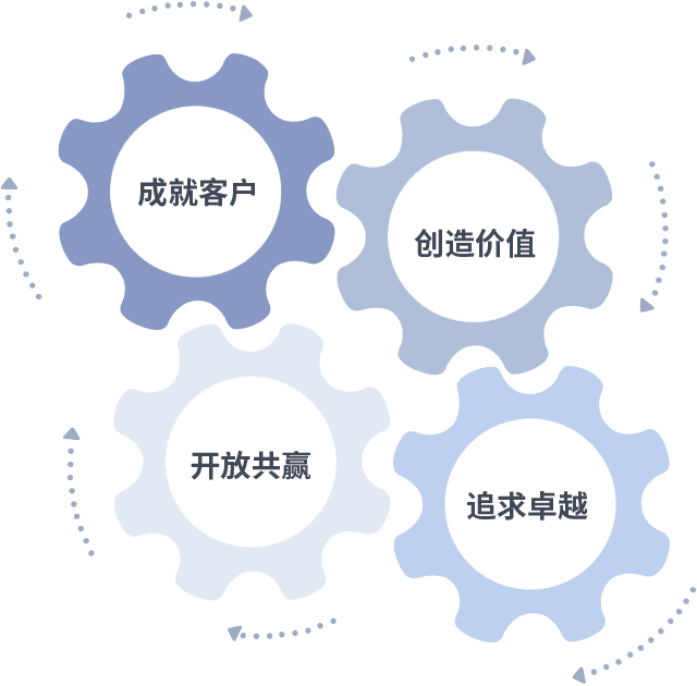 成就客户是一切决策的出发点,,创造价值是衡量所有工作的标准,,追求卓越是我们做事做人的态度,,,,开放共赢是我们的格局也是最终的结果。。。。价值观的齿轮环环相扣,,,推动着组织里的每个人不断向前。。