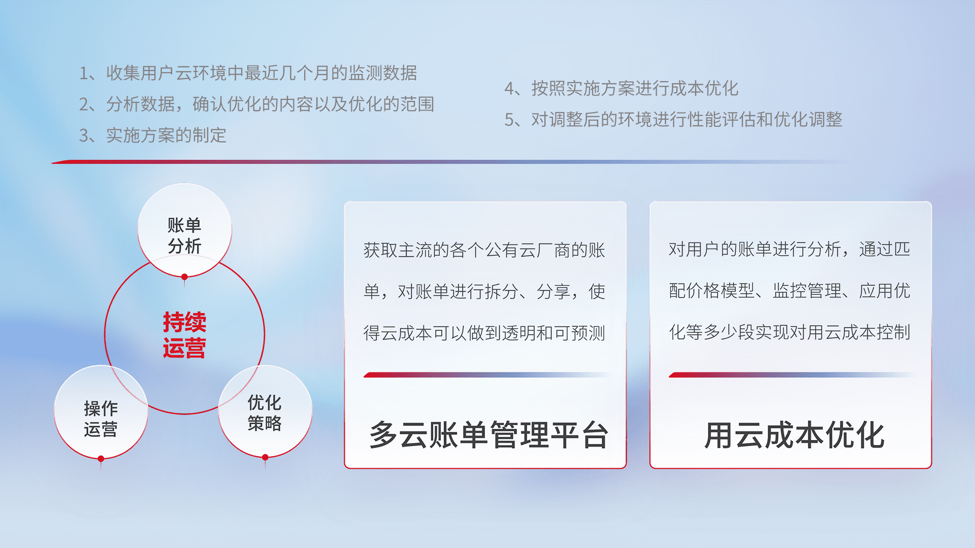 通过多云纳管,,,以统一的资源数据模型把客户的云资源进行抽象和封装,,进而实现对多云资源的统一操作,,保障云资源管理的可靠性、、、、稳定性与可用性。。量身定制化运维内容,,,,配置、、、、开发运维、、补丁管理、、备份、、、监控、、、、认证和访问管理、、审计和日常巡检等,,保障在用云过程中的可靠度,,,稳定度以及高可用率。。。。